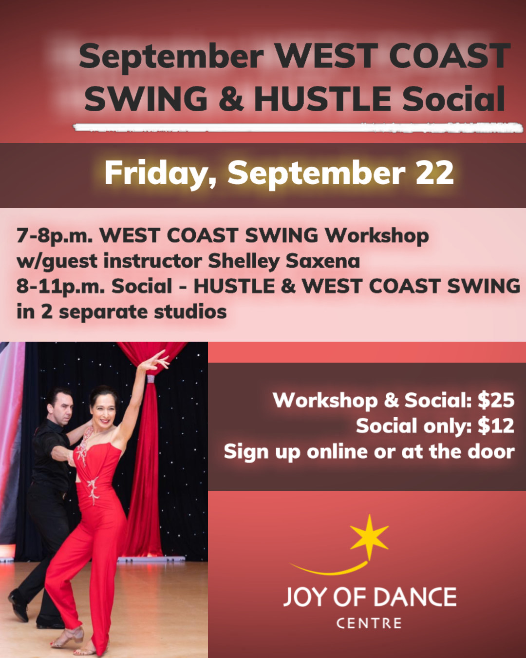 7-8 p.m. – West Coast Swing workshop with guest instructor Shelley Saxena