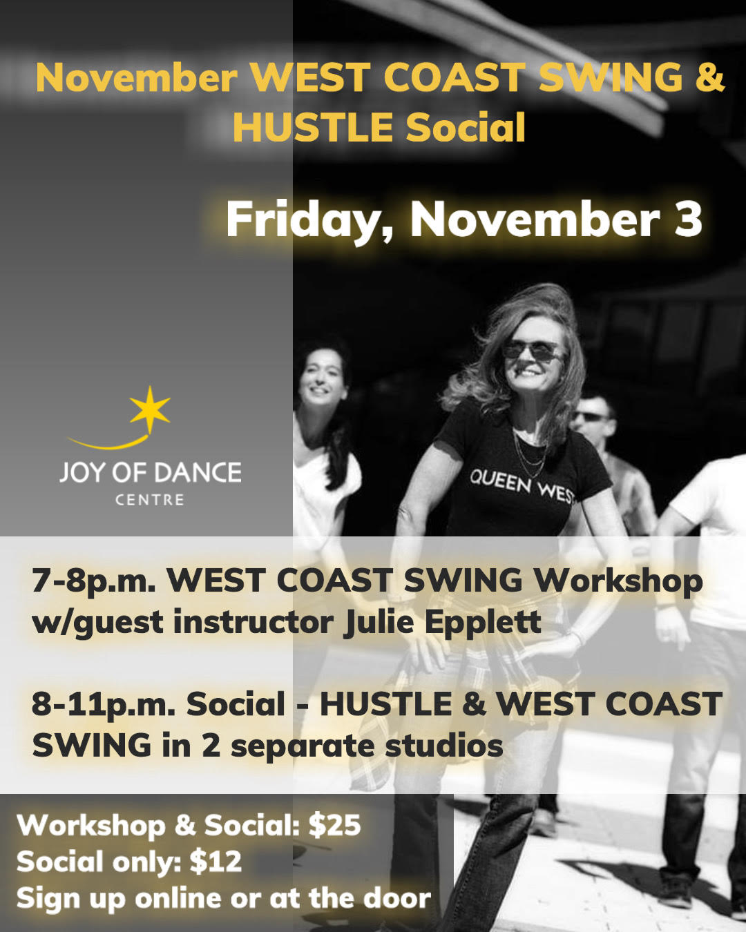 Join us on Friday, November 3 for our monthly West Coast Swing & Hustle Social.