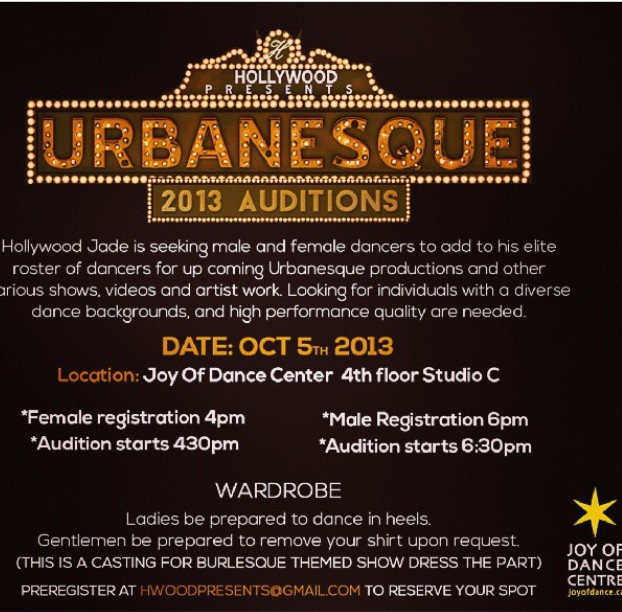 Hollywood Jade, Director and Choreographer for Urbanesque, is holding auditions at Joy of Dance on October 5. Experienced male and female dancers are needed to add to his elite roster of dancers for up coming Urbanesque productions and other various shows, videos and artistic work. Individuals with a diverse dance backgrounds, skill sets and high performance quality are needed.