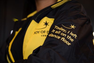 Spread a little Joy everywhere you go with our breathable unisex jacket. Waterproof, windproof and breathable, this jacket protects you from the elements so you can get to the studio no matter the weather. The outer shell is 100% polyester.